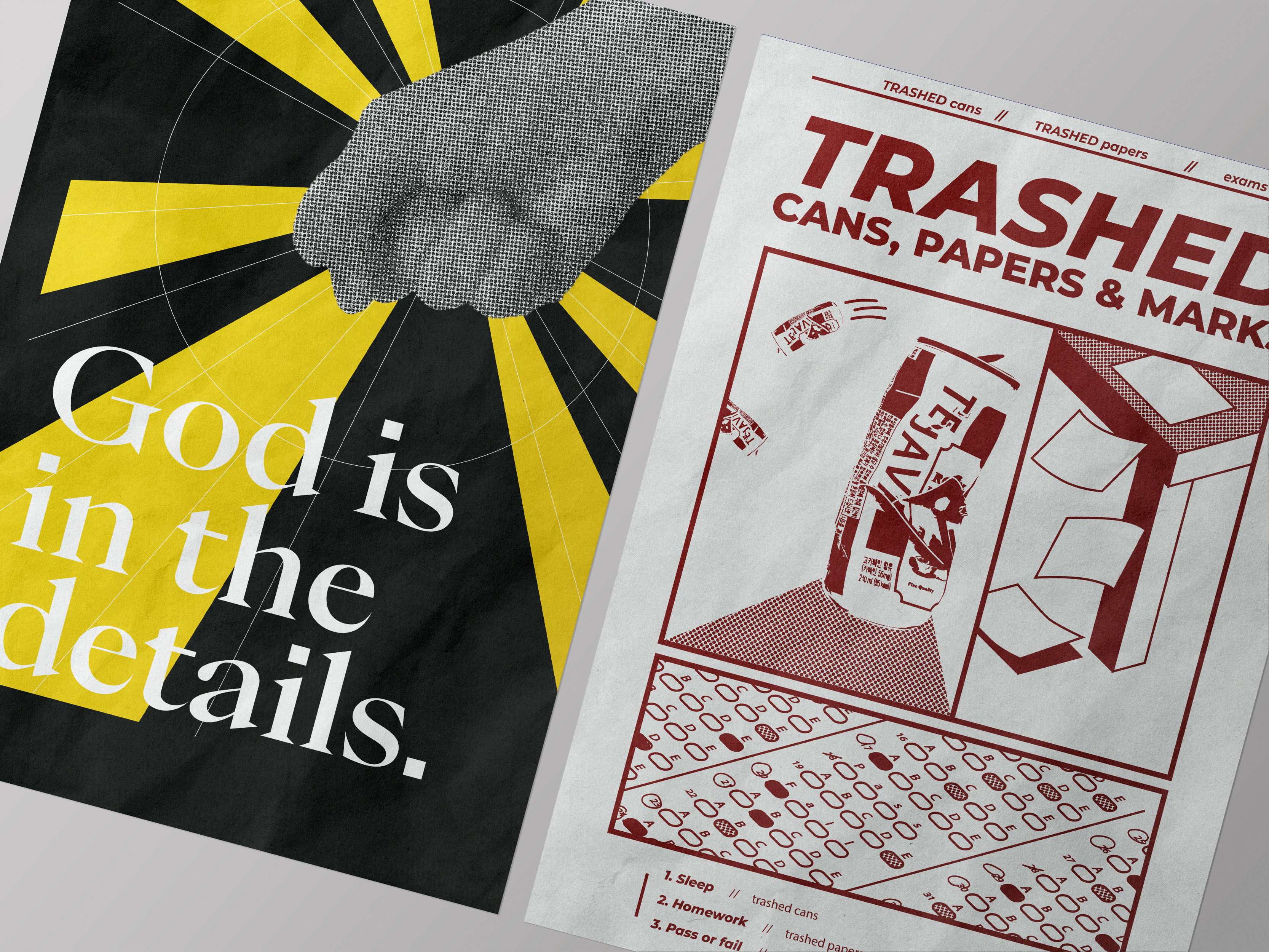 This poster series was inspired by the workaholic culture that is productive and yet mentally harmful within my school community. “God is in the details” discusses the positive qualities of a keen attention to detail, staying organized and alert. “Trashed Cans” discusses the grating routine of a student, studying for exams, consuming can after can of tea to stay awake.